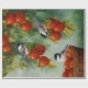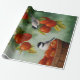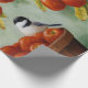 Aves no pomar de maçã durante a colheita do outono. Dois filhotes de pele preta num macieiro, enquanto um terceiro miúdo se senta num cesto cheio de fruta madura e recentemente colhida pronta para comercialização. Trabalho de arte realista criada de uma pintura original de petróleo pelo artista da vida selvagem Crista S. Forest.