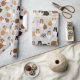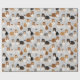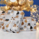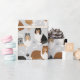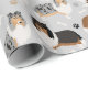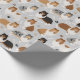 Cães de Collie Rough Cute sentam-se e ficam de pé e rollover com casacos sápidos, tricolores, unidos e brancos com ossos de cão espalhados e padrões de pegadas.