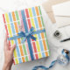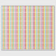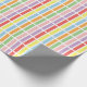 Padrão geométrico linear, retangular, listrado, de tons de arco-íris pastel azuis, laranja, verde, rosa, roxo, vermelho e amarelo.