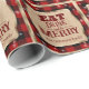 Este papel de embrulho de presente personalizado apresenta um tema de Natal festivo. O fundo apresenta um padrão de xadrez vermelho de Buffalo, rústico, espalhado com flocos de neve. Um poster de papel pergaminho vintage é impresso no centro e enquadrado com uma borda de estilo folha de ouro. A frase "Coma Bebida e Seja Feliz" é impressa no topo com uma letra vermelha e enterrada, seguida de um nome de família de amostra. A imagem é colocada sobre o papel de empacotamento que você pode personalizar para incluir seu próprio nome personalizado ou outro texto.