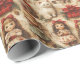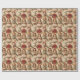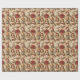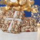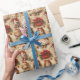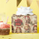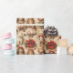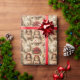 Papel de embrulho muito bonito com bonecas, gatinhos, fitas vermelhas, canetas doces, pacotes de natal, galhos de pínus e pinecones.