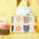Diversas xícaras coloridas de café e chá com diferentes padrões florais e cardíacos são dispostas em um padrão repetitivo contra fundo branco. Cada xícara apresenta uma combinação única de cores e designs, criando uma exibição vibrante e simétrica.