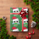 Adorável presente de Natal animal com uma bela coruja de olhos grandes em verde e vermelho vestindo um chapéu de Papai Noel. Crianças de feriado muito caprichosas embrulhando papel personalizado com seu nome.