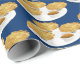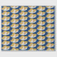 Papel de envolvimento que mostra um teste padrão de repetição de desenhos animados de sorriso do latke em uma placa com creme de leite e molho de maçã todos em um fundo azul.