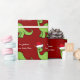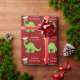 Incrível papel de embrulho de Natal para dinossauros vermelhos e verdes. Este apatossauro parece muito fofo num chapéu vermelho de Papai Noel, de férias, com um sorriso. Gosto de animais pré-históricos de Natal e presentes que as crianças vão amar. Personalize este presente para seu garotinho.