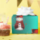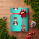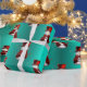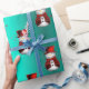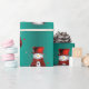 Um papel de embrulho de Natal muito bonito com um padrão de pequenos bonecos de neve, vestidos de veludo vermelho com chapéu e jaqueta de cima. Eles estão cercados por estrelas e arcos vermelhos, todos em um fundo verde/aqua brilhante.