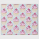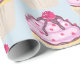 Papel embrulhando com uma ilustração de um cupcake delicioso. Glacé rosa e garoa de chocolate. Um cupcake amarelo e uma framboesa no topo. Meu Deus!