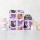 Cute black and orange cats and bows with a purple polka-dotted background