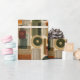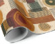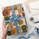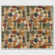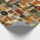 Sophisticated mid-century geometric pattern wrapping paper featuring layered circles, arches, triangles, and rectangles in forest green, burnt orange, ochre, and cream on a black background. Rich textures and retro-modern shapes create a bold design ideal for Bauhaus lovers, vintage décor fans, and anyone drawn to moody modern style.