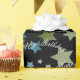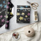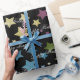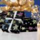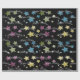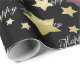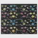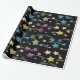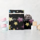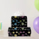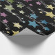 Papel de presente com uma impressão de estrelas em azul pastel, amarelo, rosa e verde. O fundo preto pode ser alterado para qualquer cor. O texto de feliz aniversário pode ser personalizado para se adequar a qualquer ocasião especial e alterado para qualquer cor.