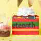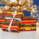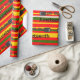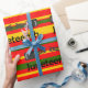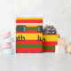 Este papel de embrulho tem a décima design de Junta de listras vermelhas, verdes e amarelas com correntes de punho quebradas e a palavra "dezenove" se repetindo por todo o design.