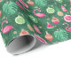 Embalagem de presente de Natal tropical verde com ornamentos como flamingos ou fruta tropical. O brilho dourado usado nesse impressão é simulado, não é uma relíquia real. Arte original de Marketa Stengl.