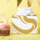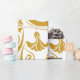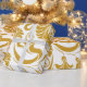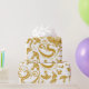 Um padrão decorativo com desenhos florais dourados e espirais em um fundo branco. A imagem mostra a tela desenrolada e depois achatada, destacando seus detalhes intrincados.