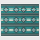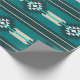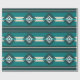 Padrão étnico boêmico asteca com formas geométricas em branco, bege e turquesa em fundo listrado