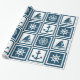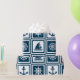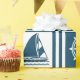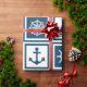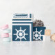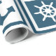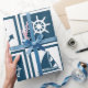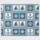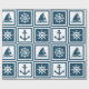 Design com temas náuticos, com roda de vela, barco à vela, bússola e decoração da âncora, em quadrados brancos e azuis com faixas