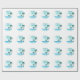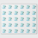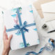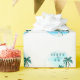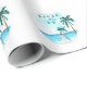 As cores principais no design são azul e verde. Os principais elementos são a noiva, a água e as palmeiras.