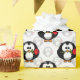 Desfile de pinguins adoráveis segurando rosas coloridos com um estilo de efeito de fundo desvanecido Refletir design