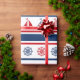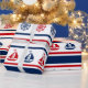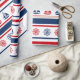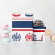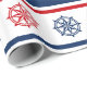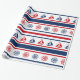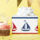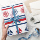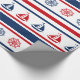 Design náutica com barco à vela e decoração de bússolas em fundo listrado vermelho, azul e branco