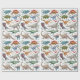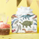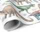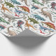 Papel de embrulho de aniversário com tema Jurássico, com fundo branco que pode ser mudado para qualquer cor, e dinossauros com aquarelas, rochas, folhagem e grama.