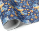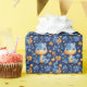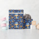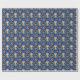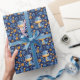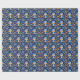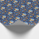 Dinossauro bebê feliz, flores amarelas e azuis papel de embrulho azul.