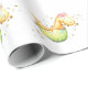 O fundo é branco com um padrão de dragões brancos e dinossauros bonitos.