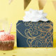 Um padrão de belos mandalas de ouro repetidas em uma cor damasco ornamentado. O ouro é brilhante para imitar a folha de ouro real. Os mandalas são projetados com trabalho intrincado e desenhado à mão e colocados sobre fundo azul marinho profundo.