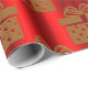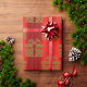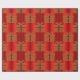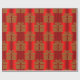 Um papel de embrulho de Natal muito na moda e festivo, com um padrão de caixas de presentes de ouro com grandes arcos sobre si, em um padrão sobre um fundo vermelho brilhante e metálico.