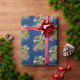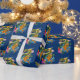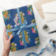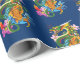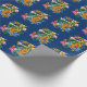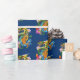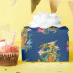 Um dragão chinês verde com um peixe koi laranja com flores de lótus e flores de cereja contra um pano de fundo de azul escuro.