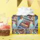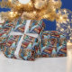 A neve cobrir levemente o chão como um drone paira sobre um tapete de boas-vindas oferecendo um presente de Natal adornado com um arco vermelho