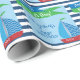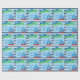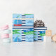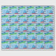 Este papel de papel de embrulho do chá de fraldas caracteriza um tema náutico. Um fundo de listras horizontais azuis escuro e brancas é acentuado com as bandeiras de ondulação verdes e azuis e um veleiro bonito. O texto nas bandeiras lê: Ahoy! É um menino! O texto customizável permite que você adicione o nome da mãe.