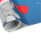 Elefante bonito com chapéu vermelho e saco com presentes de Natal sobre fundo azul com flocos de neve brancos