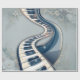 Elegance in piano keys and blossoms. The keys are in classic black and white and curve elegantly, twisting and intertwining in an artful manner to create a dynamic and visually appealing composition. These curved lines add vibrant movement and a touch of sophistication to the image. A bright, glossy bluish element runs alongside the keys, parallel to the keyboard. This element adds depth and dimension to the design, providing a modern contrast to the classic keys.