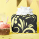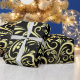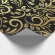 Elegant wrapping paper with a black background and intricate gold floral swirl patterns. The sheet is partially unrolled, conveying a luxurious feel.