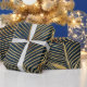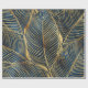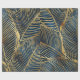 Azul e ouro de luxo modernos, desenho perfeito para decoração exótica em Na moda, eventos de glama únicos e celebrações especiais. Cheio de folhas de brilho de falso brilho dourado com folhas de farelo de brilho design, desenhadas à mão, criando um padrão invulgar de folhagem dourada incrível de trabalho de arte tropical, sobre um filme de luxo de veludo de tendência, sobre um fundo marinho-azul de luxo.