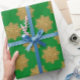 Papel festivo de embrulho com falso brilho dourado com padrão de floco de neve em fundo verde. Elegante design por apresentar seus presentes para a época de Natal.