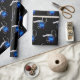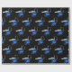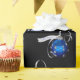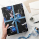 ornamento de feriado azul com fita branca e pérolas isoladas em preto. Feliz Natal está em uma etiqueta branca na fonte do script do rico.