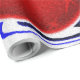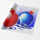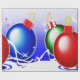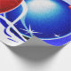 Esta imagem retrata bolas de Natal em vermelho, azul e verde. As fitas e as estrelas são vistas em branco, azul e vermelho. Foi adicionado um plano de fundo azul. Uma falha foi adicionada a este design. Este papel de embalagem de Natal está disponível em estilos e tamanhos variados.