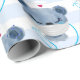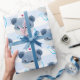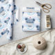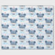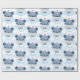 Papel de embrulho com uma ilustração fofa de um urso azul vestindo um chapéu de enfermeiro com um pouco de coração. Também vestindo uma máscara protetora e tem um estetescópio azul.