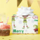 Este papel de embrulho de fotos personalizado e bonito apresenta um tema de Natal festivo. Uma imagem de dois elfos-menino é fotografada dançando na parte inferior. Você pode substituir os rostos dos elfos pelas fotos personalizadas do seu filho. Uma saudação de Feliz Natal é impressa no topo com a palavra "Feliz" impressa em um design de folha verde, e a palavra "Natal" impressa em um padrão de balão de folha listrada de cana-doce. Um nome de família de exemplo é impresso abaixo em uma fonte verde branca. Flocos de neve com estilo brilhante azul acentuam o fundo.