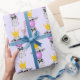 Esfregando papel com um padrão charmoso e engraçado. Projetado com uma lama branca soprando uma grande bolha rosa enquanto mascava goma. Vestindo uma coroa dourada e uma gravata arco preta. Fundo roxo claro.