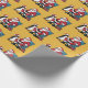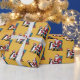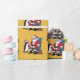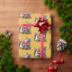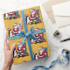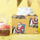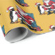 Uma design de Natal engraçada de um Pai Natal com um fundo amarelo. Papai Noel está sentado numa cadeira com bengala. Há um pinguim ao lado dele. O pinguim também está vestindo um chapéu de Papai Noel. A imagem global tem um estilo de vintage.
