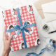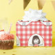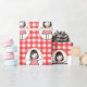 Bonita figura de palito com cabelo e margaridas em fundo de gingham vermelho e branco. Ela está vestindo tênis, vestido de gingham, e um colar de pérolas.