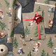 Um papel de embalagem de férias com esquilos vermelhos pintados a cores aquáticas numa floresta de neve em papel de cor Kraft.