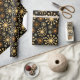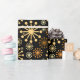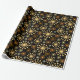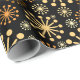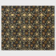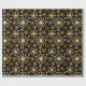 Papel de embrulho com padrão geométrico preto e dourado elegante. O design apresenta um padrão contínuo de um motivo de fogo de artifício ou explosão estelar estilizado e abstrato em tons metálicos de ouro, bronze e cobre sobre um fundo preto ousado. Este padrão geométrico de estrela do meio do século moderno é um design versátil e atual. Este papel de embrulho decorativo e luxuoso é ideal para ocasiões especiais, como casamentos, aniversários, Natal e celebrações de Ano Novo.