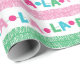 Um pequeno retrato e um pequeno gatinho, este papel de embrulho cômico apresenta terras coloridas de Natal. As terras alternadas soletram "fa la". As cores incluem: azul, vermelho, rosa, verde. Em branco. Vem num rolo contínuo. Perfeito para o Natal/Natal.