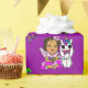 Uma linda fada estilizada desenhada à mão no estilo de arte popular com um presente embrulhado em vestido roxo para o aniversário de uma menina. Roxo, loira lavanda. A pequena fada tem a pele mais escura para representar meninas hispânicas ou afro-americanas.