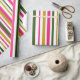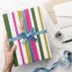 Papel de embrulho desbastado moderno com listras brancas, verdes, douradas e cor-de-rosa de diferentes dimensões. Um olhar moderno, mas retrô, que é um alternativo, o tradicional papel vermelho e verde de embalagem de Natal.