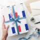 Este papel de embrulho de presente de Natal francês personalizado contém a frase "Joyeux Noël" impressa em uma fonte elegante e preta. Joyeux Noël é francês por "Feliz Natal". A bandeira francesa é colocada por cima e por baixo da frase. Um floco de neve dourado brilhante é colocado no centro. A parte inferior apresenta um nome de família de exemplos que pode ser personalizado para incluir seu próprio nome, mensagem ou cotação personalizados.