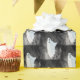 Um fantasma branco sorridente em fumaça sobre fundo preto.