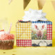 A colorful patchwork quilt design featuring gingham fabric and farm animals